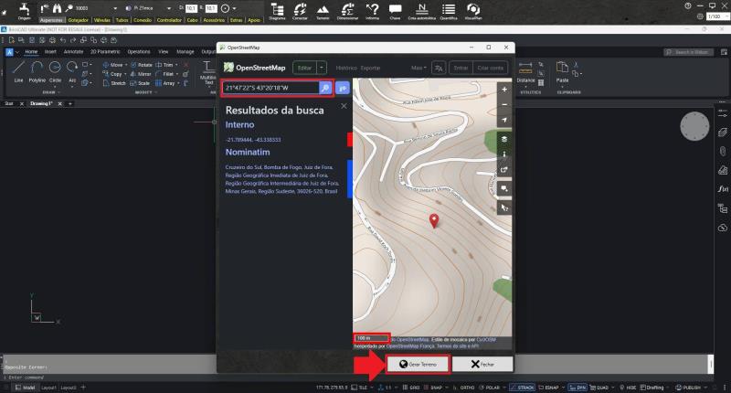 2-Nela, insira as coordenadas geográficas ou o endereço desejado. Quando o local for encontrado, centralize o terreno e observe a escala do mapa, pois quando obter a imagem de satélite é desejável que seja a mesma escala, isso facilitará o trabalho. Em seguida, clique em Gerar terreno — as curvas de nível serão inseridas automaticamente no CAD.