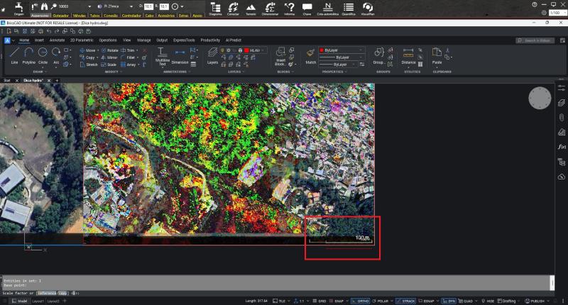 Desenhe uma linha reta com o tamanho da escala que deseja, nesse caso foi desenhado uma linha de 100 metros, depois basta usar o "scale" para deixar a escala gráfica da imagem do mesmo tamanho da linha de referência.