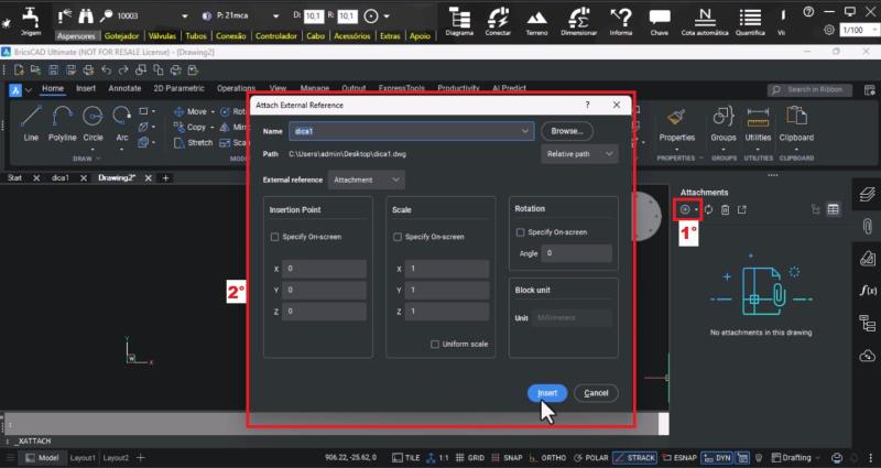 Ao abrir, será exibida uma janela com parâmetros de inserção (ponto de inserção, escala e rotação). Na maioria dos casos, não é necessário alterar nada, basta confirmar em “Insert”.