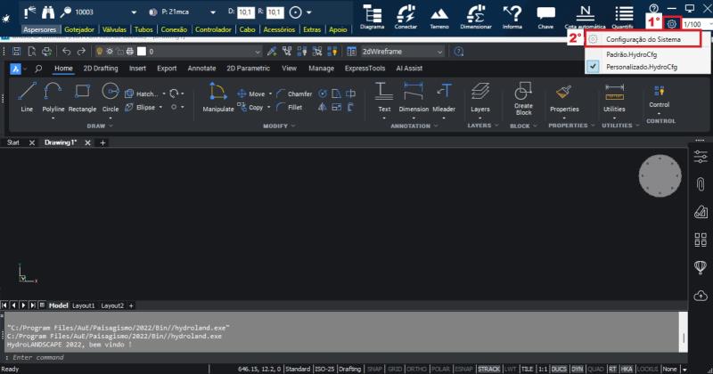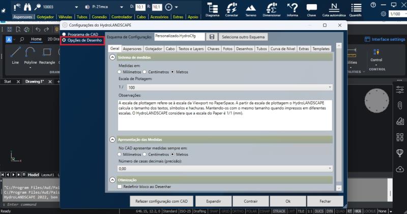 Aba Desenhos: oferece opções para modificar o tamanho dos símbolos de origem, aspersores, válvulas, controladores, conexões e acessórios.